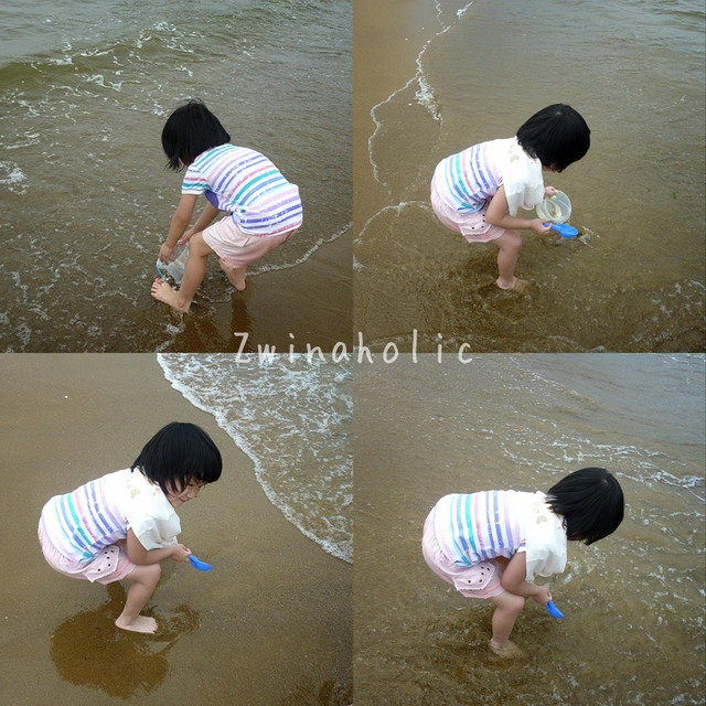 EE本來在玩泡泡,不願意玩水,過了許久也體驗了海浪襲來的有趣!